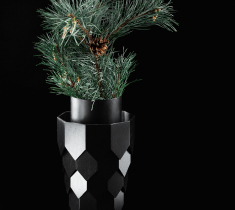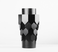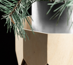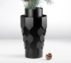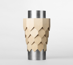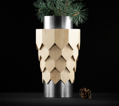 The vase from the GONT collection is inspired by the nature of the Carpathians, namely the fractal geometry of the scales of cones of coniferous plants. The aesthetic of the cone also resonates with the roofing material - Gotna, which is often used in Hutsul architecture for roofing. GONT Vase consists of a cylindrical stainless steel base and decorative elements made of natural wood or veneered plywood.