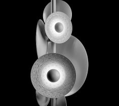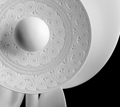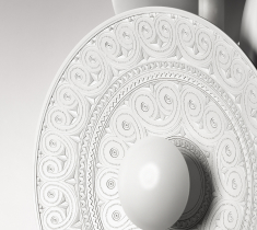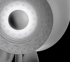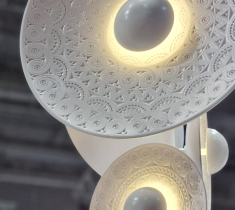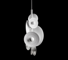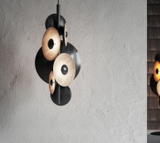 This object became a synthesis of traditional and modern worldview. The HCC7 chandelier is like a space satellite, which with its antennas (locators) radiates into the world forgotten folk crafts, thoughts and talents of generations, relays the aesthetics of traditional crafts in a modern object in terms of design and function. The lamp consists of seven wooden lampshades (cherry) with an ethnic ornament, mounted on a metal frame.
