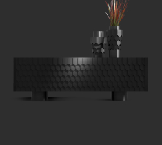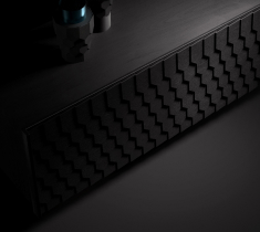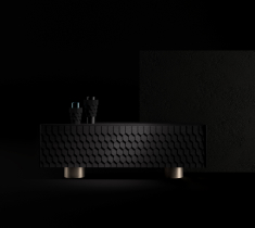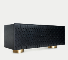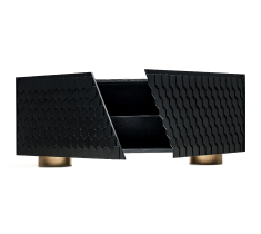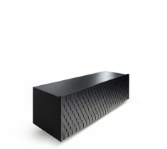 Цей чорний мінімалістичний комод оснащений передніми відкривними прихованими дверцятами, які прикрашені декором у вигляді гонта - покрівельного матеріалу. Ця нестандартна деталь додає комоду унікальний характер і робить його відмінним від інших меблів. Гонт додає текстуру і глибину до комода, створюючи цікавий візуальний ефект. Він пропонує достатньо місця для зберігання і стане витонченим акцентом у вашому інтер'єрі.